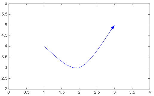 x = [1,2,3] y = [4,3,5] arrowline(x, y, color='b', iscurve=True, headwidth=10) xlim(0, 4) ylim(2, 6) antialias(True)