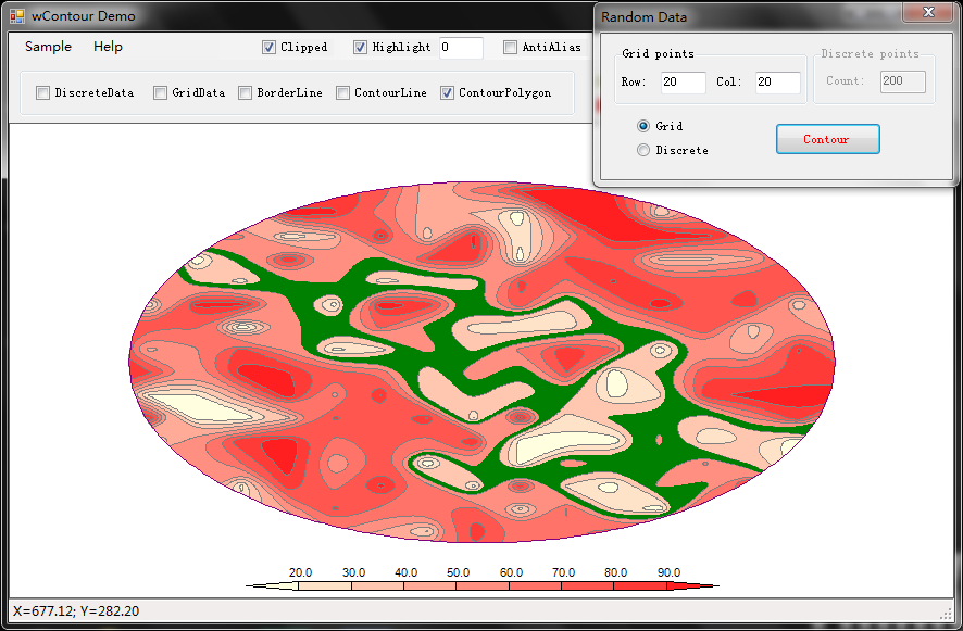 The wContour class library was developed using Java and C# to implement the contour-related algorithms used in software development for data analysis in the geosciences using the Java or .NET environment. The comprehensive description of the algorithms for contour line tracing, filling and clipping of the complex grid data with many irregularly distributed undefined value points was given. Border lines were traced from beginning and contour polygons with holes were output finally. Inverse distance weighted (IDW) and Cressman objective analysis methods are provided for discrete data interpolation to grid data. Algorithms for contour line tracing, smoothing, filling and clipping are included to fulfil the contour functions from complex grid data. A streamline analysis method is also provided.