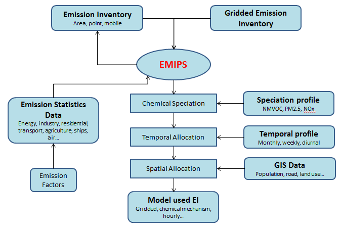 EMIPS (EMission Inventory Processing System) software was developed to create model used emission inventory (EI) data from two kinds of data sources: basic emission dataset (including activity levels, emission factors data and so on) and gridded emission dataset products.